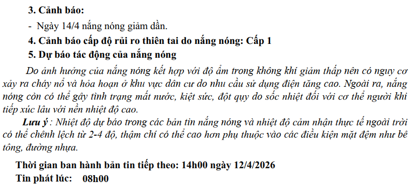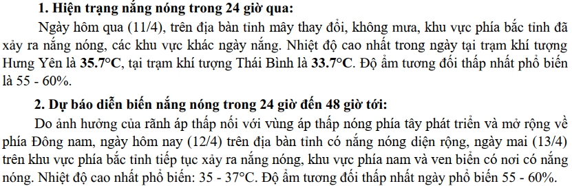 TIN DỰ BÁO NẮNG NÓNG KHU VỰC TỈNH HƯNG YÊN (08h00 NGÀY 12/4/2026)