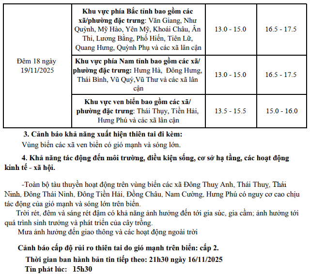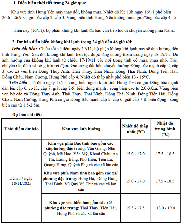 TIN KHÔNG KHÍ LẠNH TĂNG CƯỜNG KHU VỰC TỈNH HƯNG YÊN (15h30 NGÀY 16/11/2025)