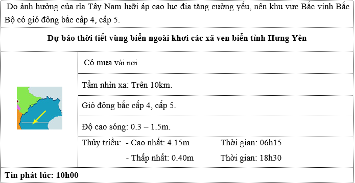 • BẢN TIN DỰ BÁO HẢI VĂN 10 NGÀY VÙNG BIỂN TỈNH HƯNG YÊN (Từ 04/12/2025 đến 13/12/2025)