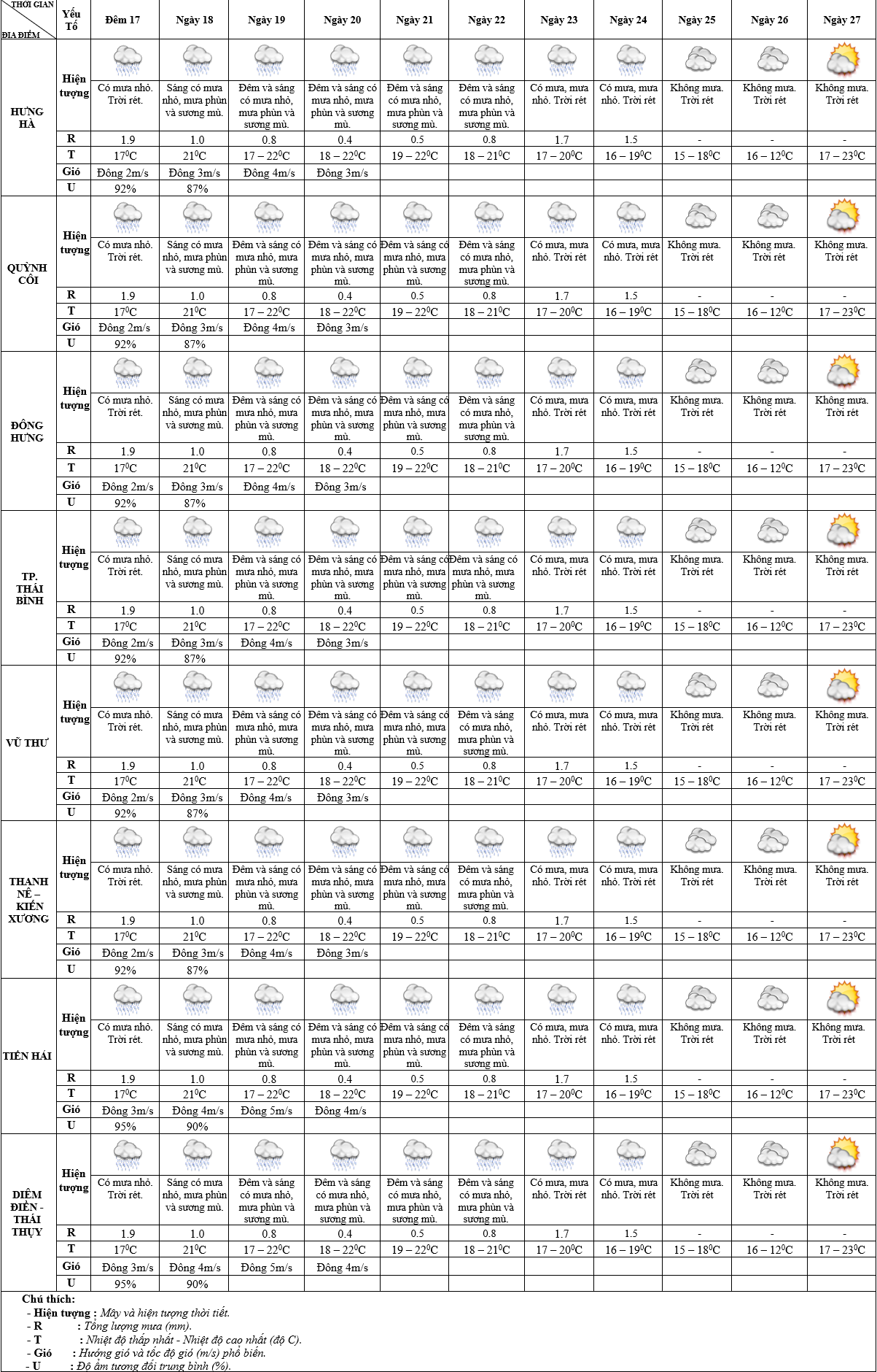 DỰ BÁO THỜI TIẾT ĐIỂM 10 NGÀY KHU VỰC THÁI BÌNH TỪ ĐÊM 17 – 27/02/2025