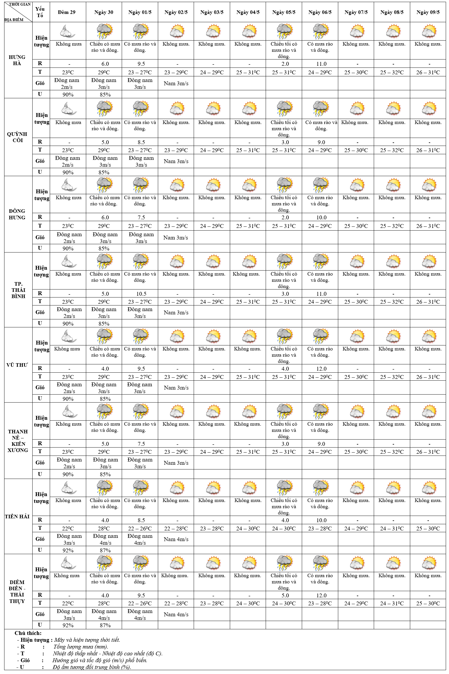 DỰ BÁO THỜI TIẾT ĐIỂM 10 NGÀY KHU VỰC THÁI BÌNH TỪ ĐÊM 29/4 – 09/5/2025