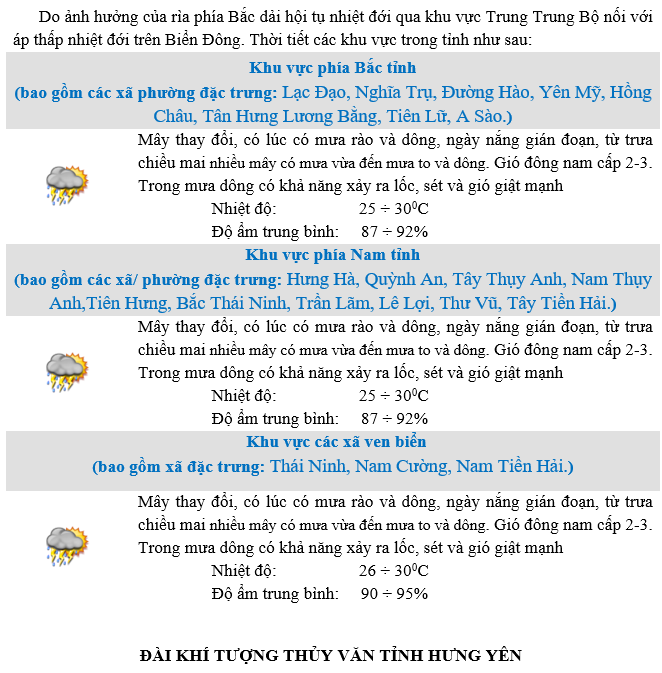 • DỰ BÁO THỜI TIẾT KHU VỰC HƯNG YÊN ĐÊM 30/11 NGÀY 01/12/2025