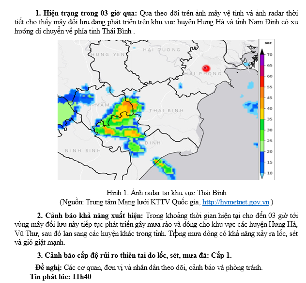 TIN CẢNH BÁO DÔNG, TỐ, LỐC, SÉT, MƯA ĐÁ VÀ MƯA LỚN CỤC BỘ TRÊN KHU VỰC TỈNH THÁI BÌNH NGÀY 05/7/2024 (Lần 2)