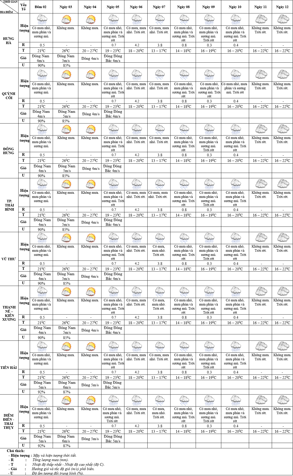 DỰ BÁO THỜI TIẾT 10 NGÀY KHU VỰC THÁI BÌNH TỪ ĐÊM 02 – 12/3/2025