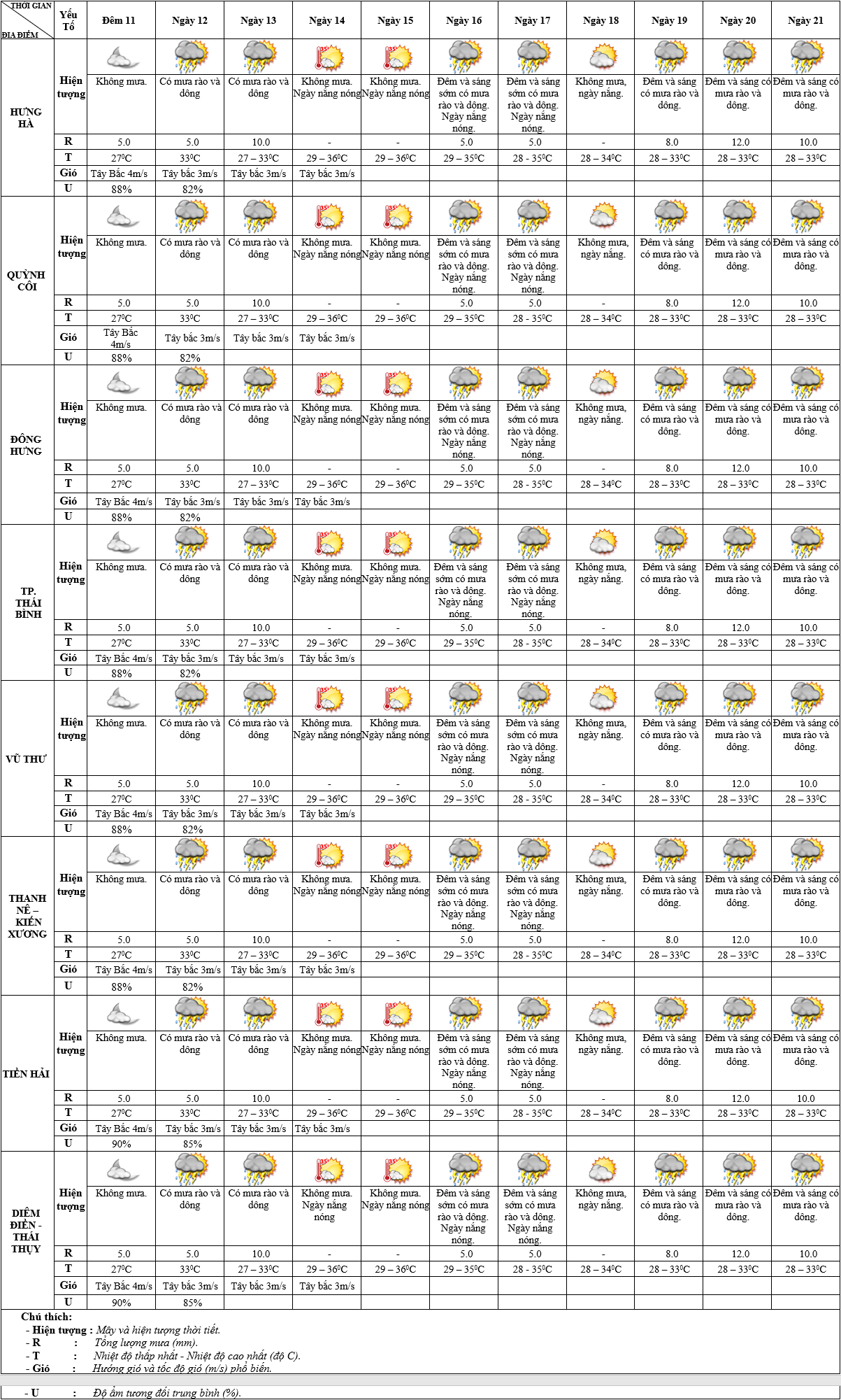 DỰ BÁO THỜI TIẾT 10 NGÀY KHU VỰC THÁI BÌNH TỪ ĐÊM 11 – 21/6/2025