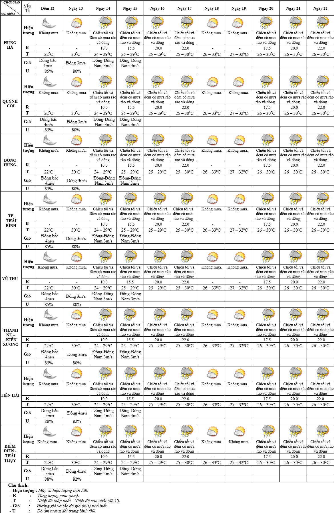 DỰ BÁO THỜI TIẾT 10 NGÀY KHU VỰC THÁI BÌNH TỪ ĐÊM 12 – 22/5/2025