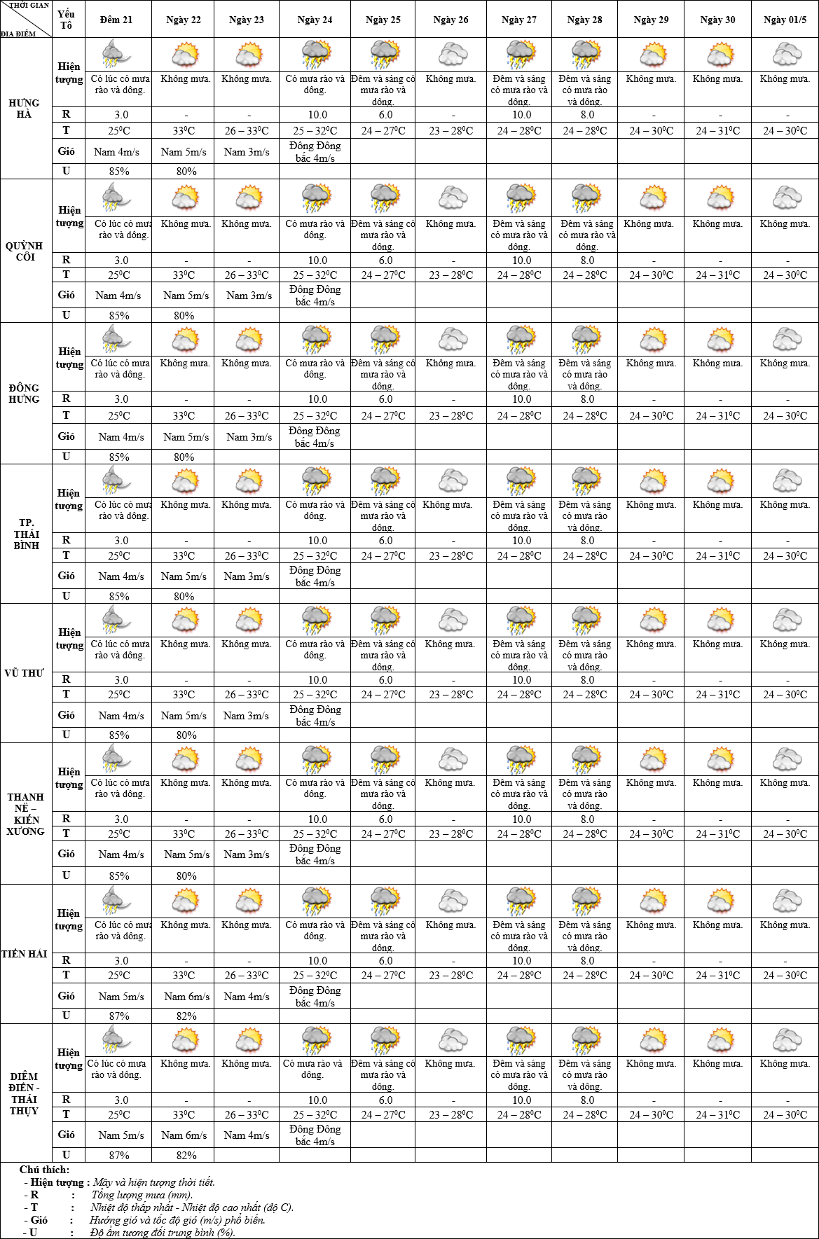 DỰ BÁO THỜI TIẾT 10 NGÀY KHU VỰC THÁI BÌNH TỪ ĐÊM 21/4 – 01/5/2025