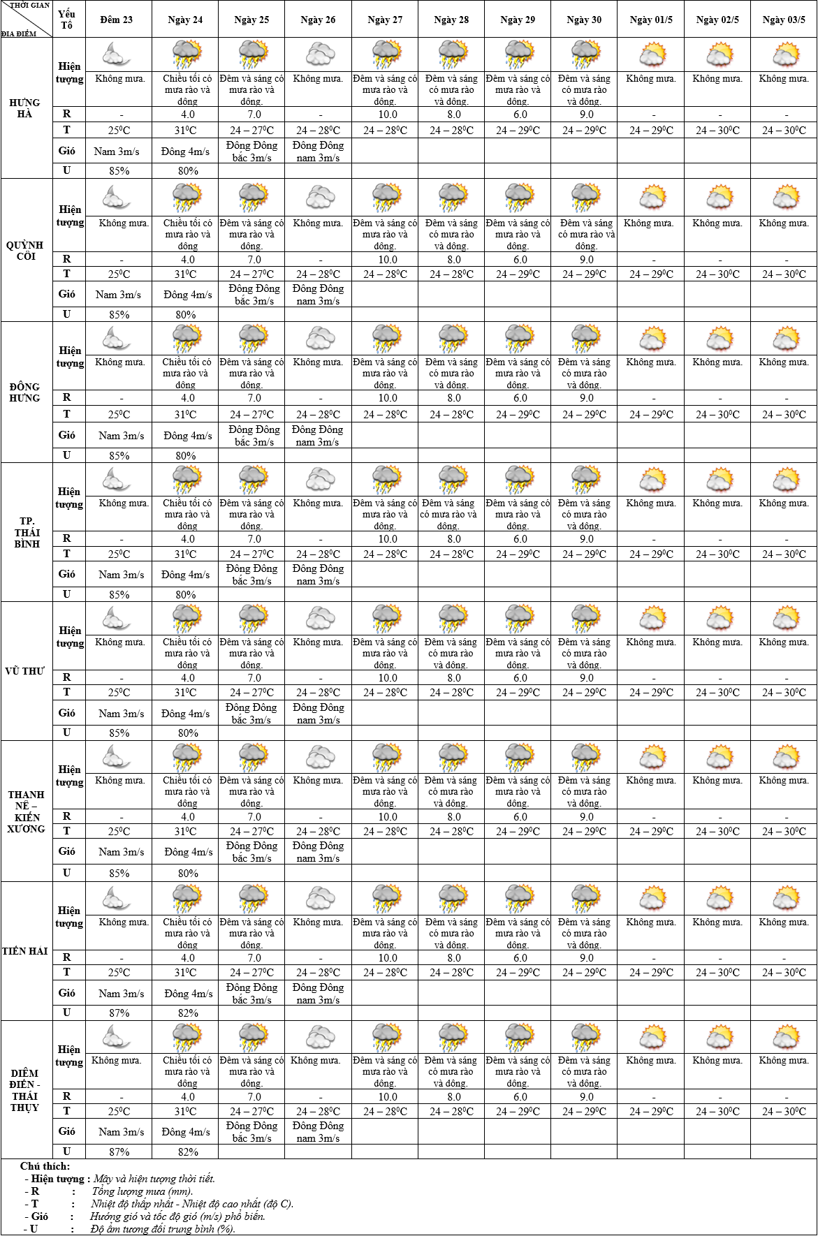 DỰ BÁO THỜI TIẾT 10 NGÀY KHU VỰC THÁI BÌNH TỪ ĐÊM 23/4 – 03/5/2025