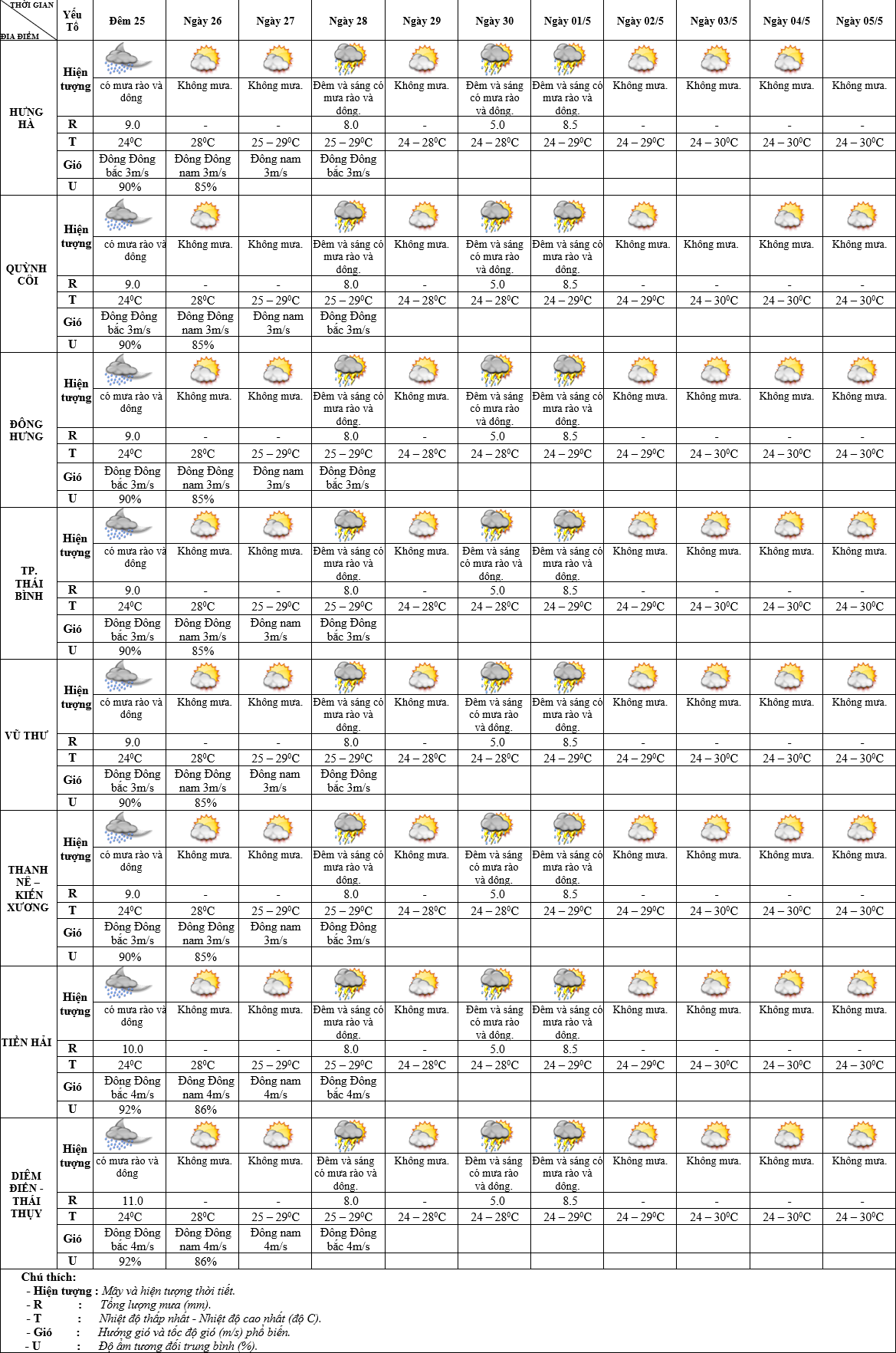 DỰ BÁO THỜI TIẾT 10 NGÀY KHU VỰC THÁI BÌNH TỪ ĐÊM 25/4 – 05/5/2025