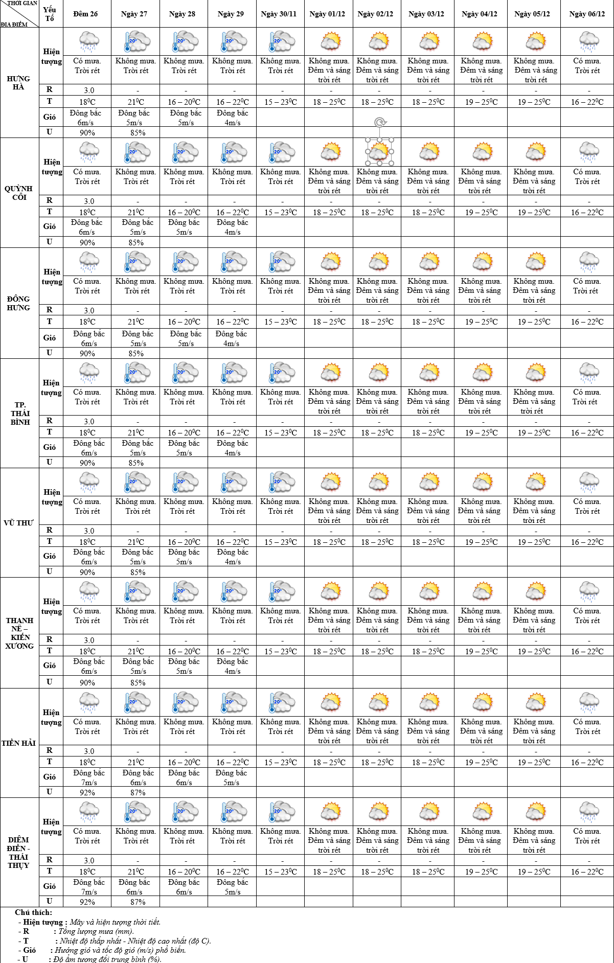 DỰ BÁO THỜI TIẾT 10 NGÀY KHU VỰC THÁI BÌNH TỪ ĐÊM 26/11 – 06/12/2024