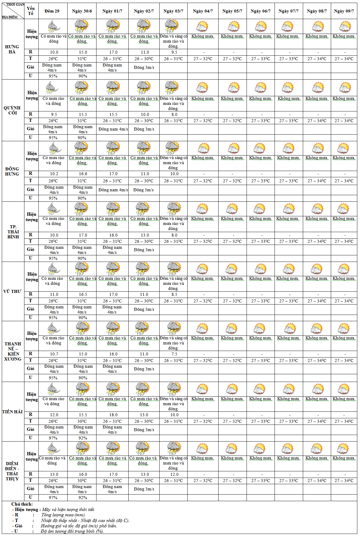 DỰ BÁO THỜI TIẾT 10 NGÀY KHU VỰC THÁI BÌNH TỪ ĐÊM 29/6 – 09/7/2025