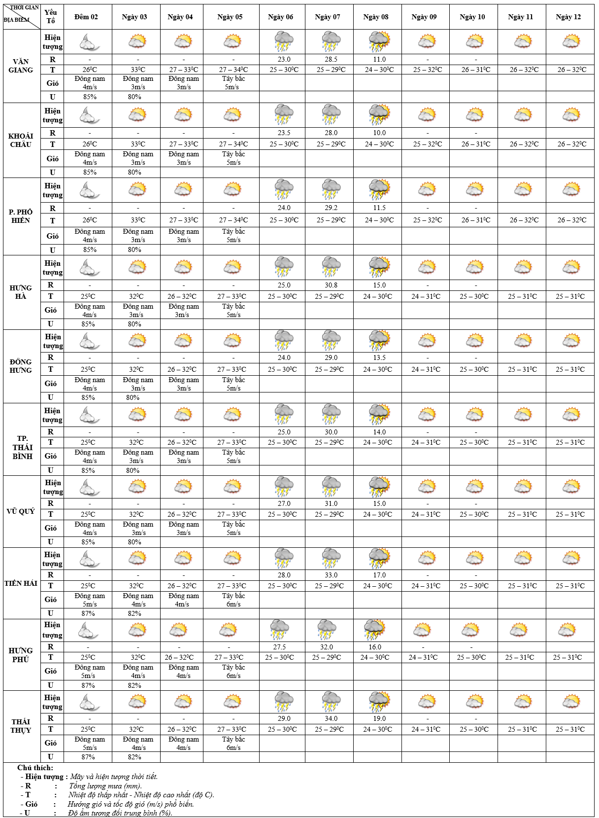 DỰ BÁO THỜI TIẾT ĐIỂM 10 NGÀY KHU VỰC HƯNG YÊN TỪ ĐÊM 02 - 12/10/2025