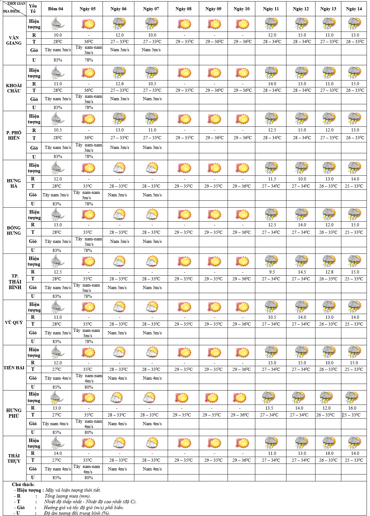 • DỰ BÁO THỜI TIẾT ĐIỂM 10 NGÀY KHU VỰC HƯNG YÊN TỪ ĐÊM 04 - 14/12/2025
