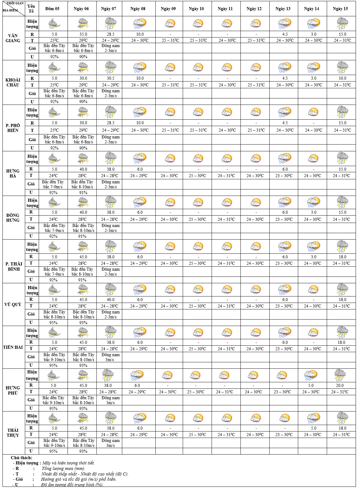DỰ BÁO THỜI TIẾT ĐIỂM 10 NGÀY KHU VỰC HƯNG YÊN TỪ ĐÊM 05 - 15/10/2025