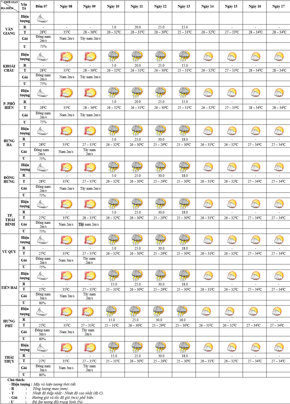 DỰ BÁO THỜI TIẾT ĐIỂM 10 NGÀY KHU VỰC HƯNG YÊN TỪ ĐÊM 07 – 17/7/2025