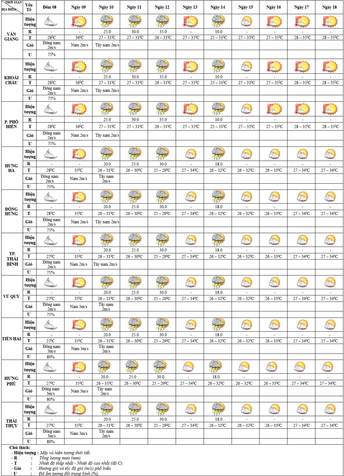 DỰ BÁO THỜI TIẾT ĐIỂM 10 NGÀY KHU VỰC HƯNG YÊN TỪ ĐÊM 08 – 18/7/2025