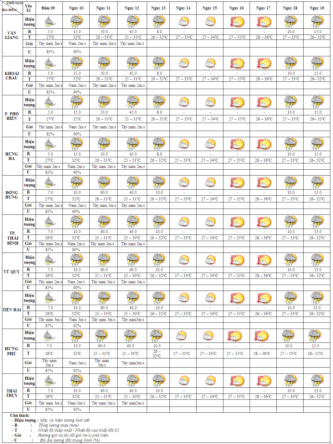 DỰ BÁO THỜI TIẾT ĐIỂM 10 NGÀY KHU VỰC HƯNG YÊN TỪ ĐÊM 09 – 19/7/2025