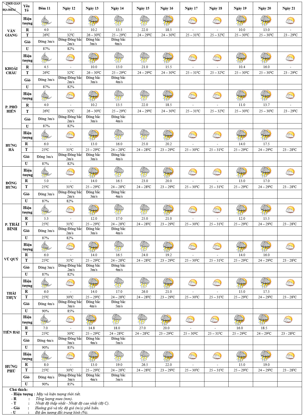 DỰ BÁO THỜI TIẾT ĐIỂM 10 NGÀY KHU VỰC HƯNG YÊN TỪ ĐÊM 11 - 21/10/2025