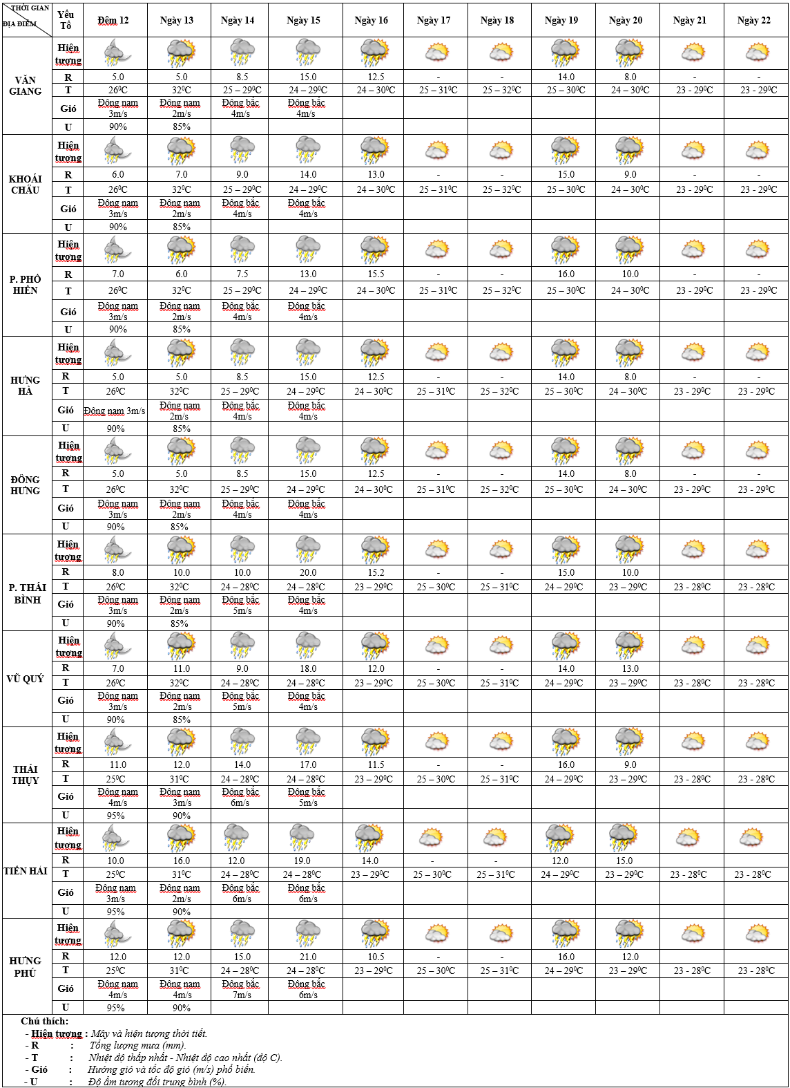 DỰ BÁO THỜI TIẾT ĐIỂM 10 NGÀY KHU VỰC HƯNG YÊN TỪ ĐÊM 12 - 22/10/2025