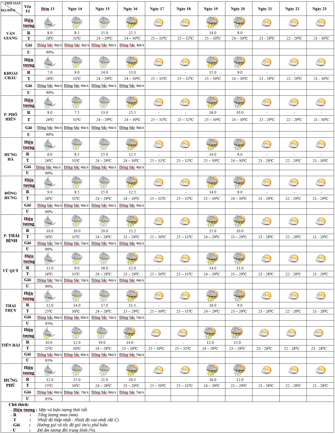 DỰ BÁO THỜI TIẾT ĐIỂM 10 NGÀY KHU VỰC HƯNG YÊN TỪ ĐÊM 13 - 23/10/2025