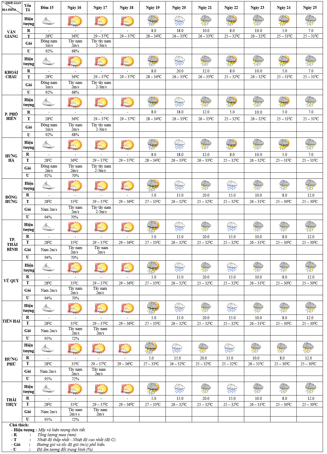 DỰ BÁO THỜI TIẾT ĐIỂM 10 NGÀY KHU VỰC HƯNG YÊN TỪ ĐÊM 15 – 25/7/2025