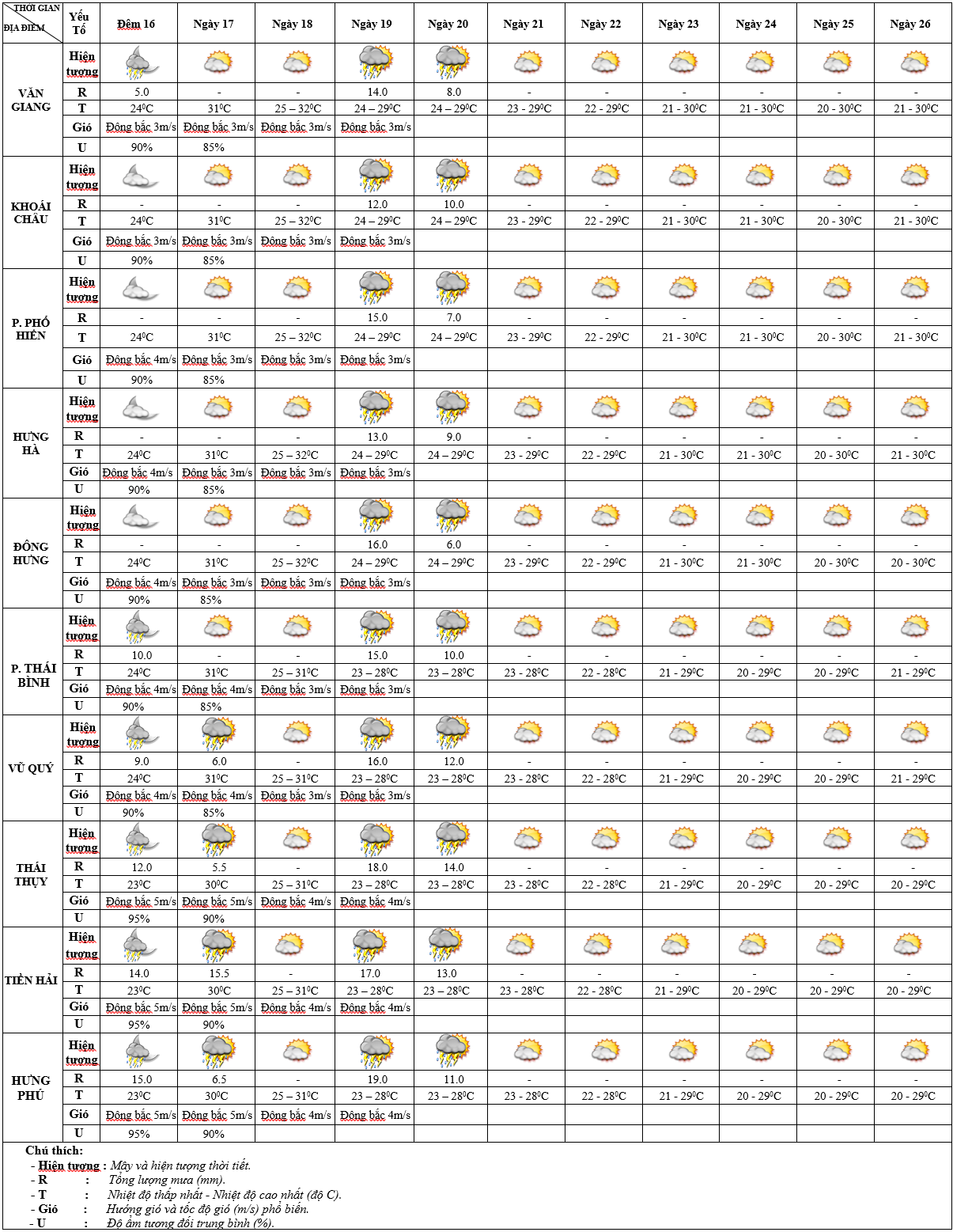 DỰ BÁO THỜI TIẾT ĐIỂM 10 NGÀY KHU VỰC HƯNG YÊN TỪ ĐÊM 16 - 26/10/2025