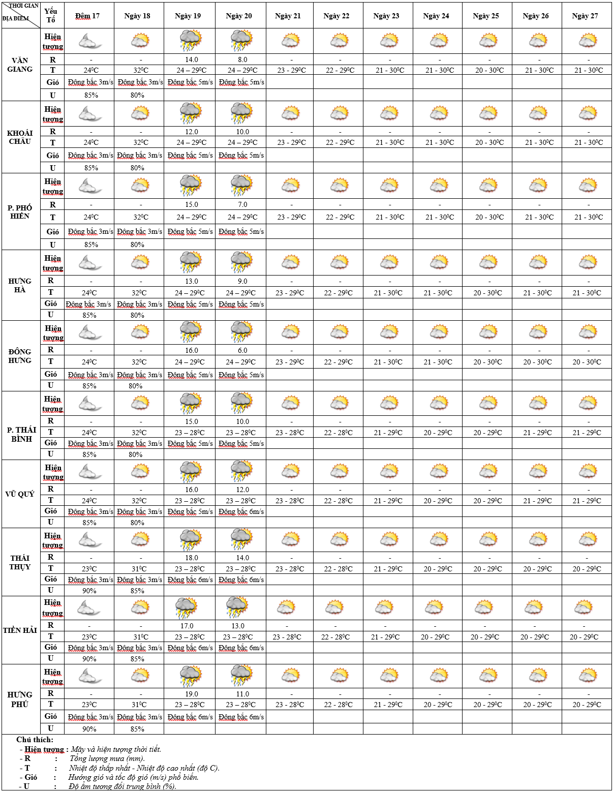 DỰ BÁO THỜI TIẾT ĐIỂM 10 NGÀY KHU VỰC HƯNG YÊN TỪ ĐÊM 17 - 27/10/2025