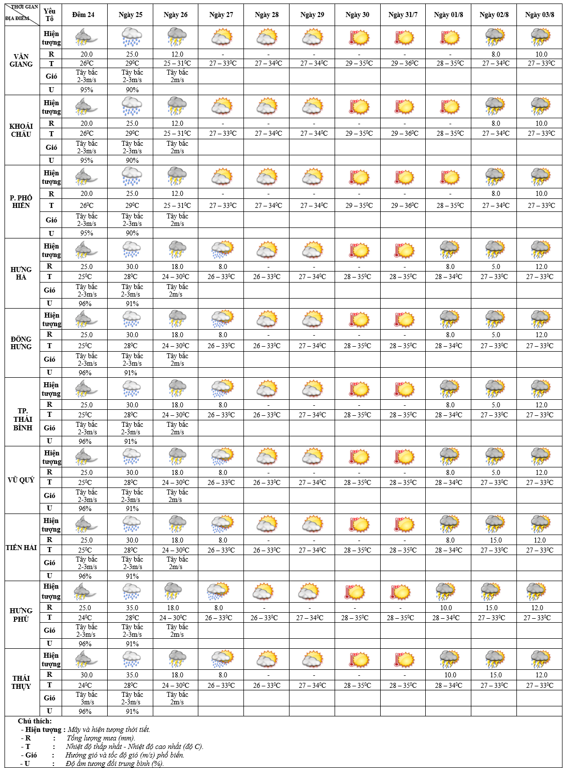 DỰ BÁO THỜI TIẾT ĐIỂM 10 NGÀY KHU VỰC HƯNG YÊN TỪ ĐÊM 24/7 – 03/8/2025
