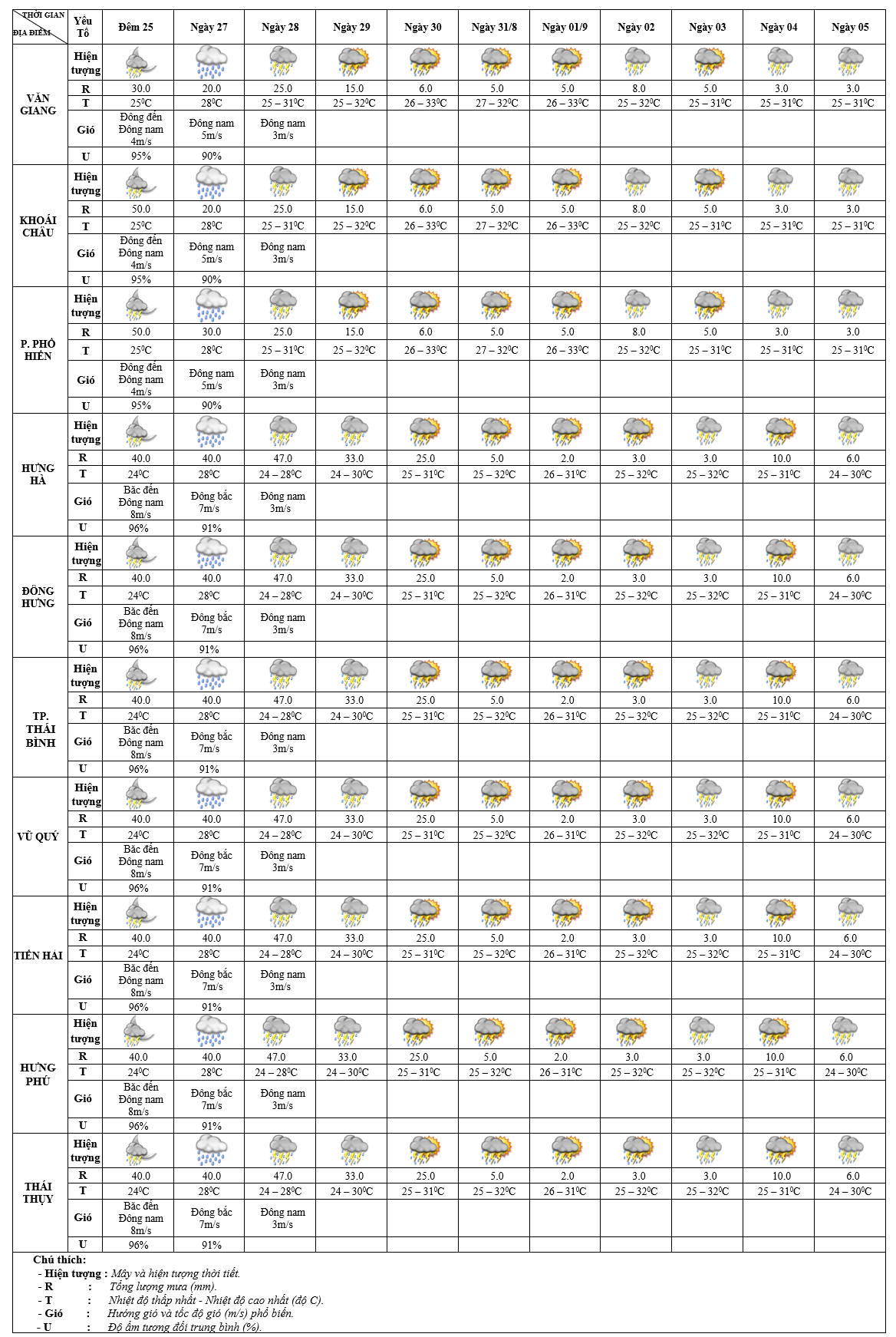 DỰ BÁO THỜI TIẾT ĐIỂM 10 NGÀY KHU VỰC HƯNG YÊN TỪ ĐÊM 26/8 – 05/9/2025