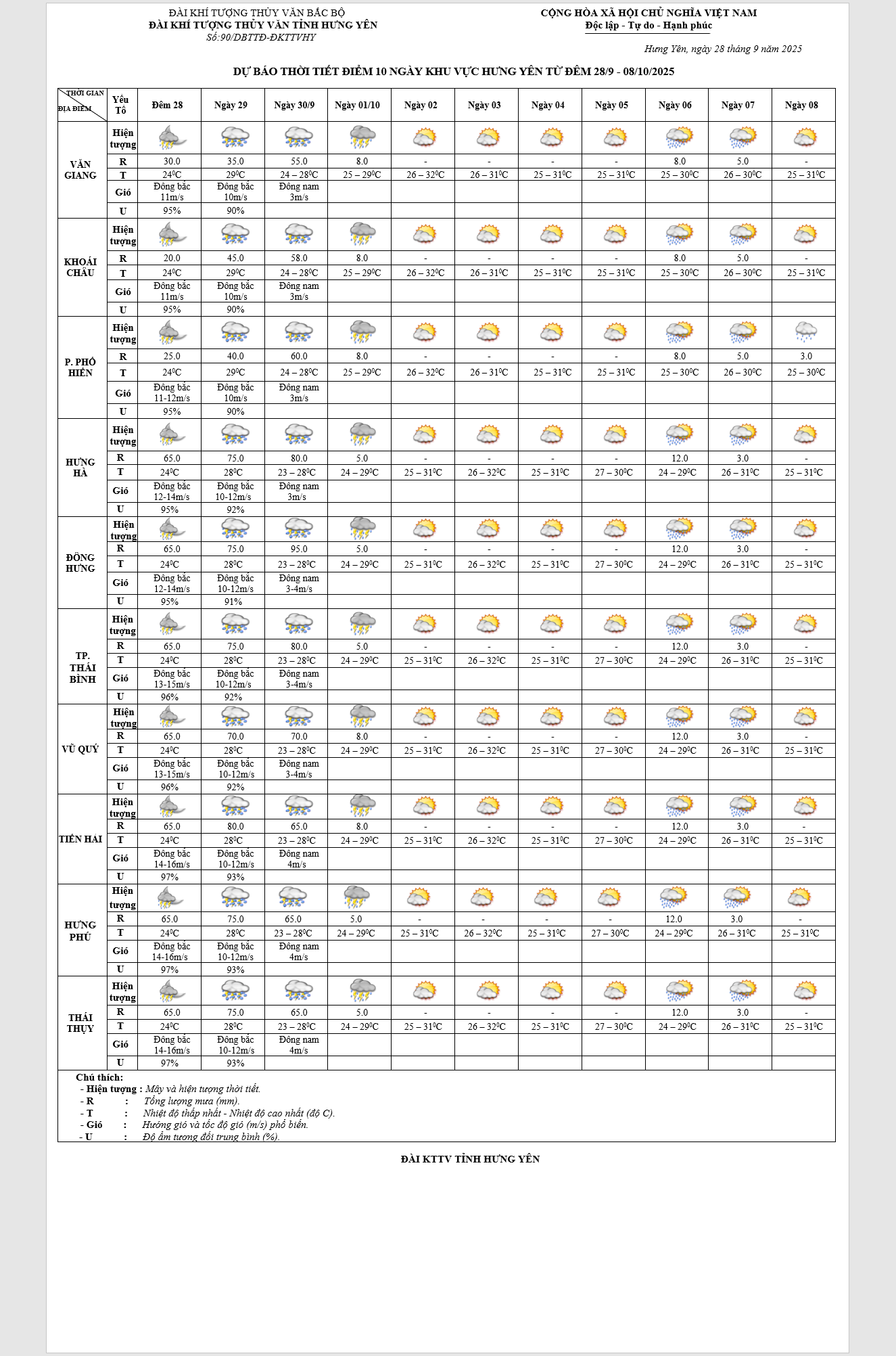 DỰ BÁO THỜI TIẾT ĐIỂM 10 NGÀY KHU VỰC HƯNG YÊN TỪ ĐÊM 28/9 - 08/10/2025