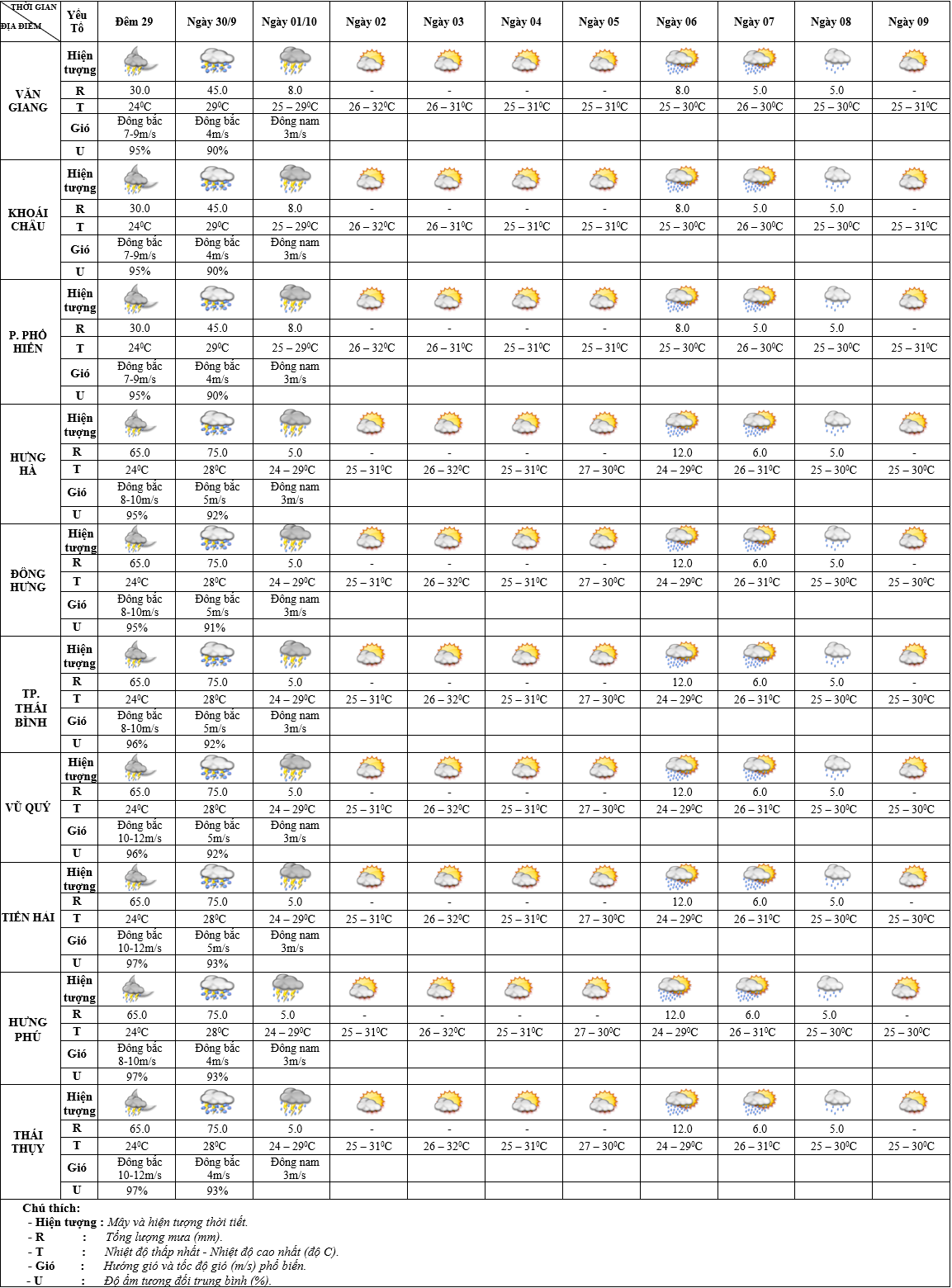 DỰ BÁO THỜI TIẾT ĐIỂM 10 NGÀY KHU VỰC HƯNG YÊN TỪ ĐÊM 29/9 - 09/10/2025