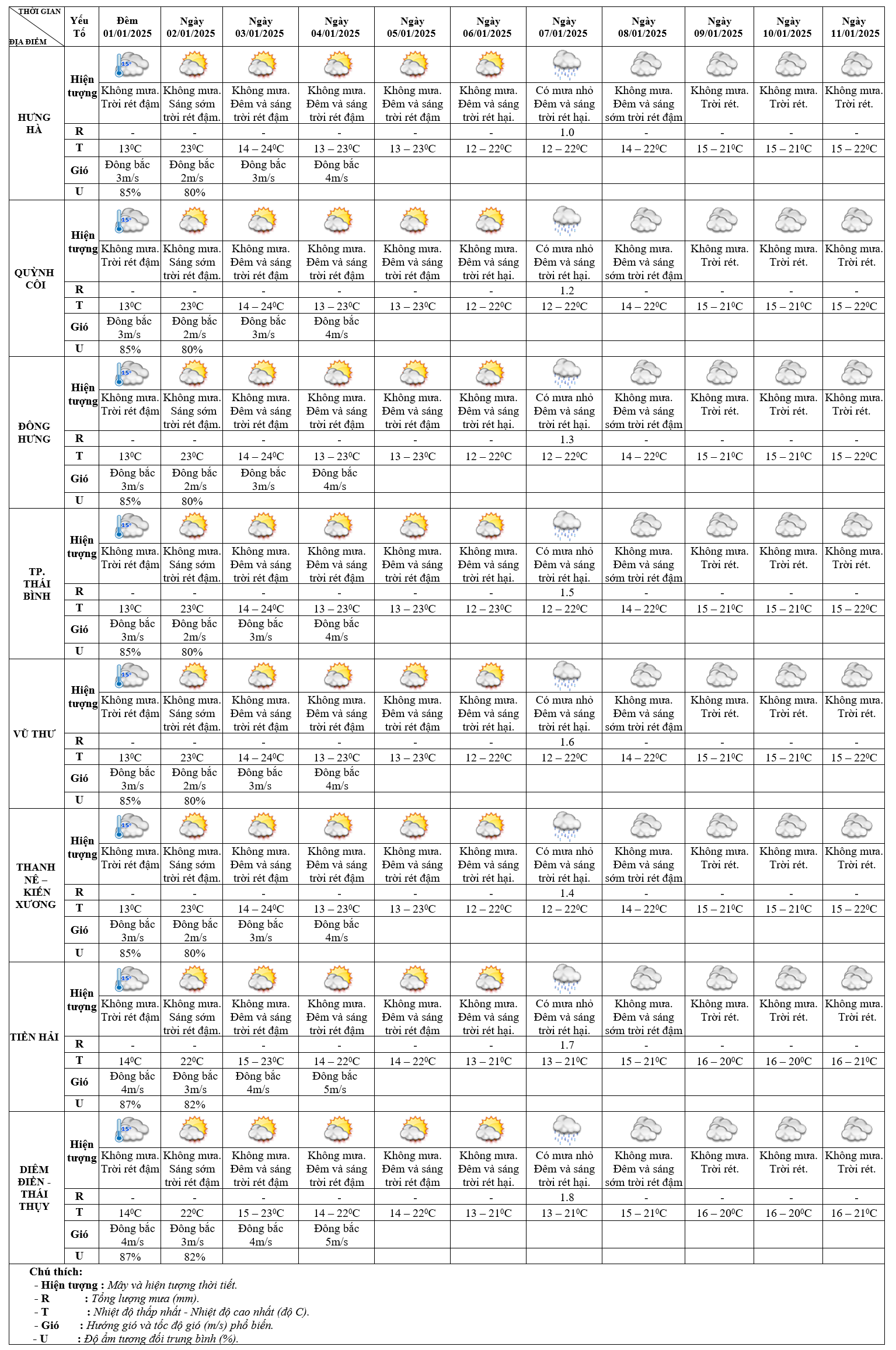 DỰ BÁO THỜI TIẾT ĐIỂM 10 NGÀY KHU VỰC THÁI BÌNH TỪ ĐÊM 01 – 11/01/2025