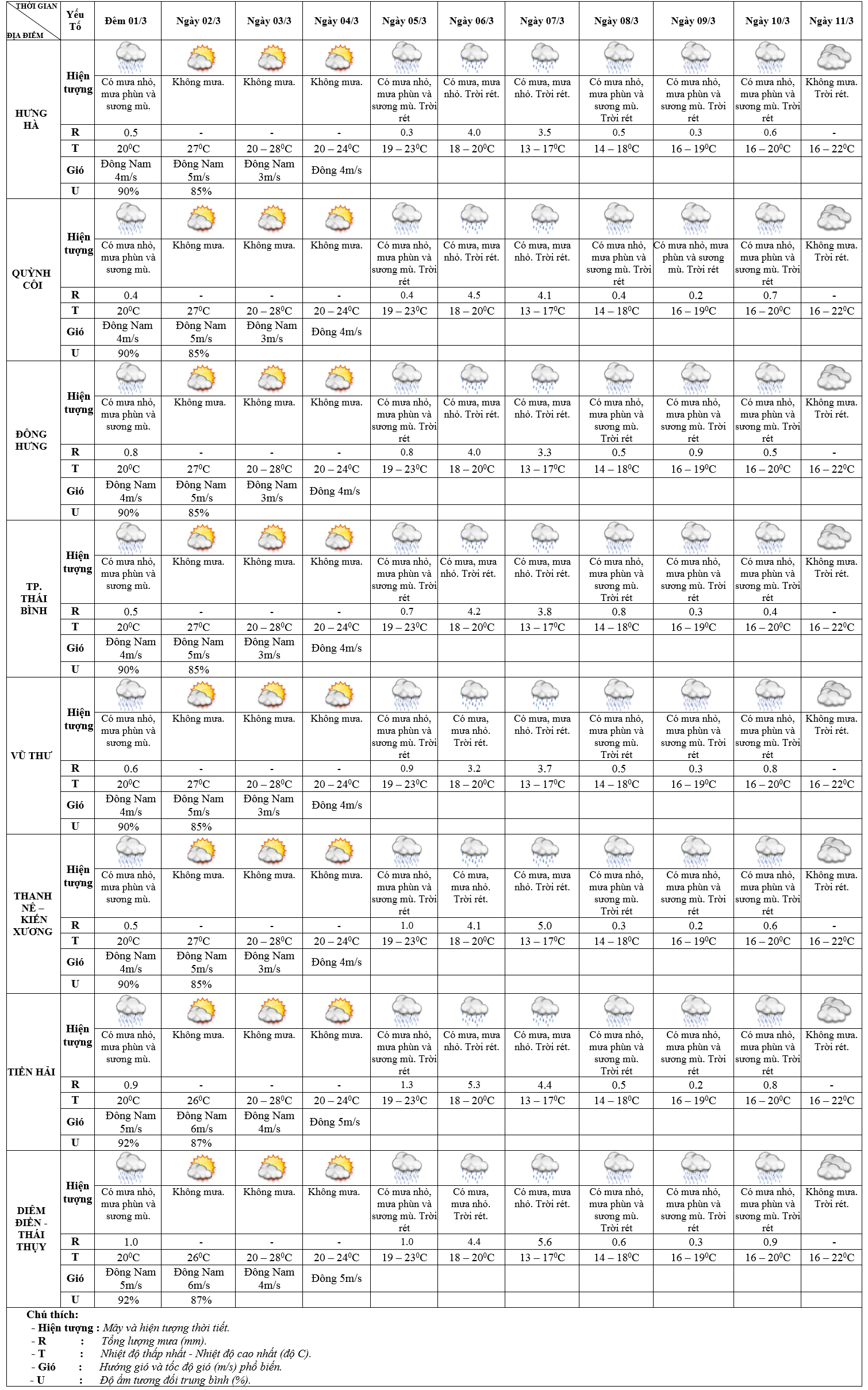 DỰ BÁO THỜI TIẾT ĐIỂM 10 NGÀY KHU VỰC THÁI BÌNH TỪ ĐÊM 01 – 11/3/2025