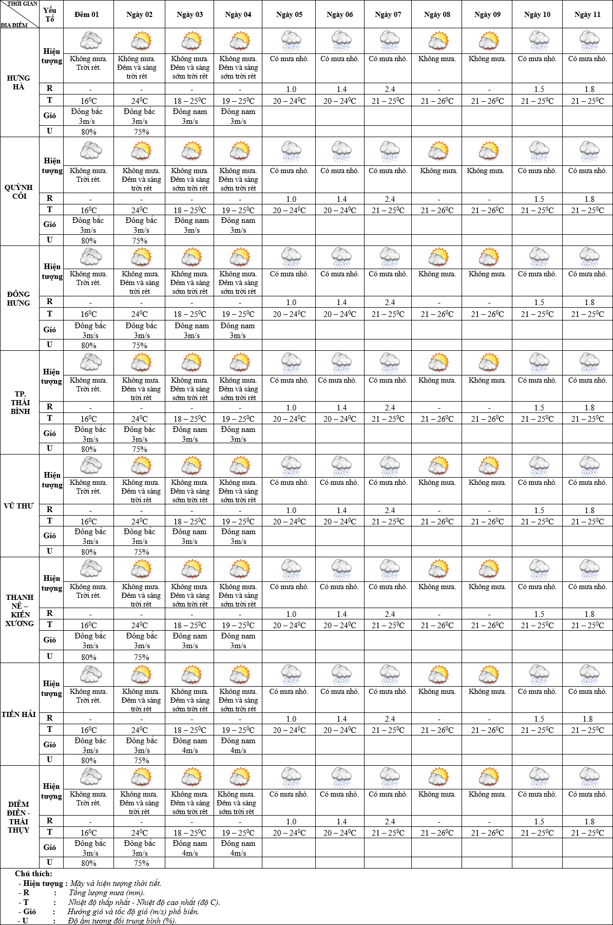 DỰ BÁO THỜI TIẾT ĐIỂM 10 NGÀY KHU VỰC THÁI BÌNH TỪ ĐÊM 01 – 11/4/2025