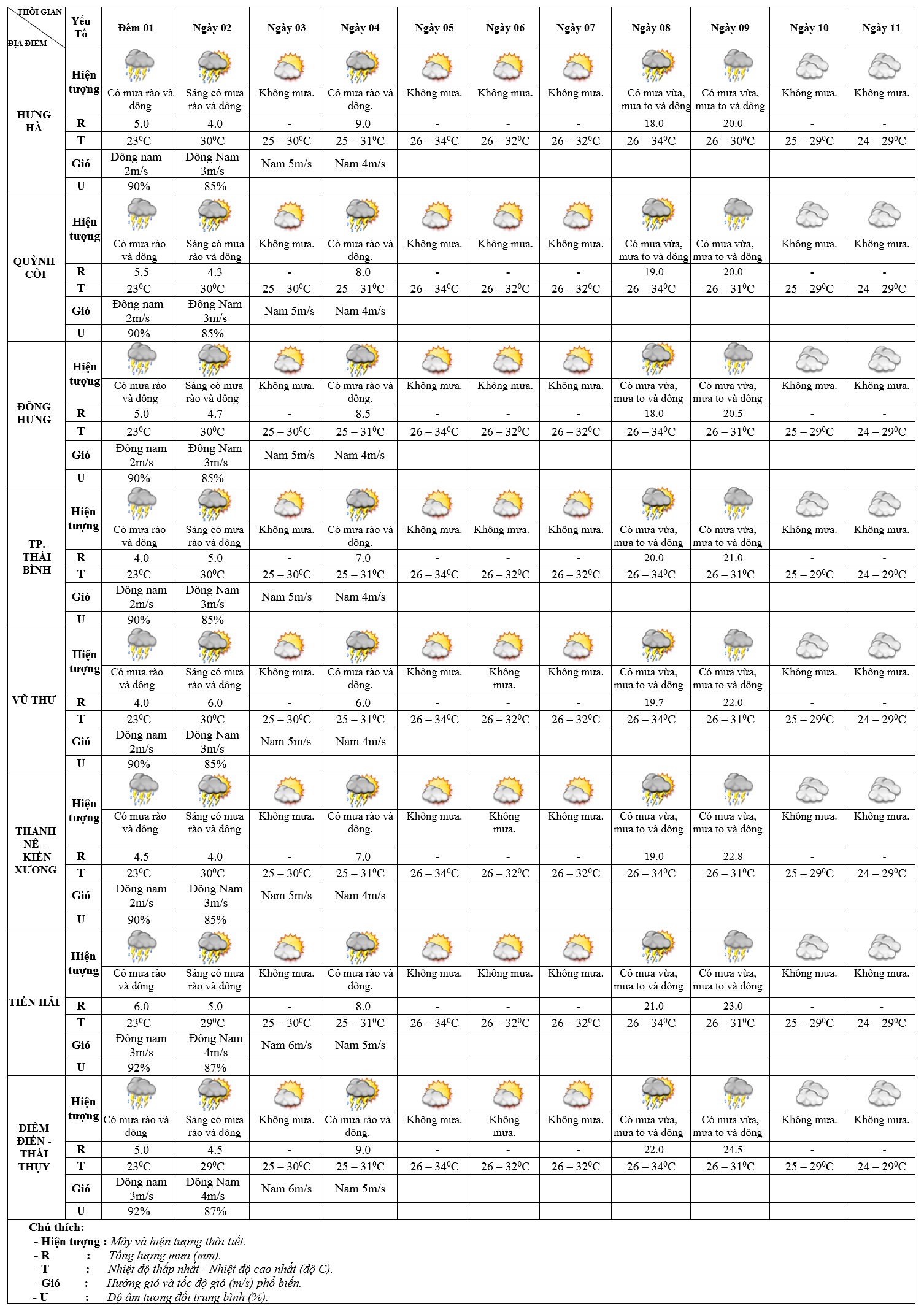 DỰ BÁO THỜI TIẾT ĐIỂM 10 NGÀY KHU VỰC THÁI BÌNH TỪ ĐÊM 01 – 11/5/2025