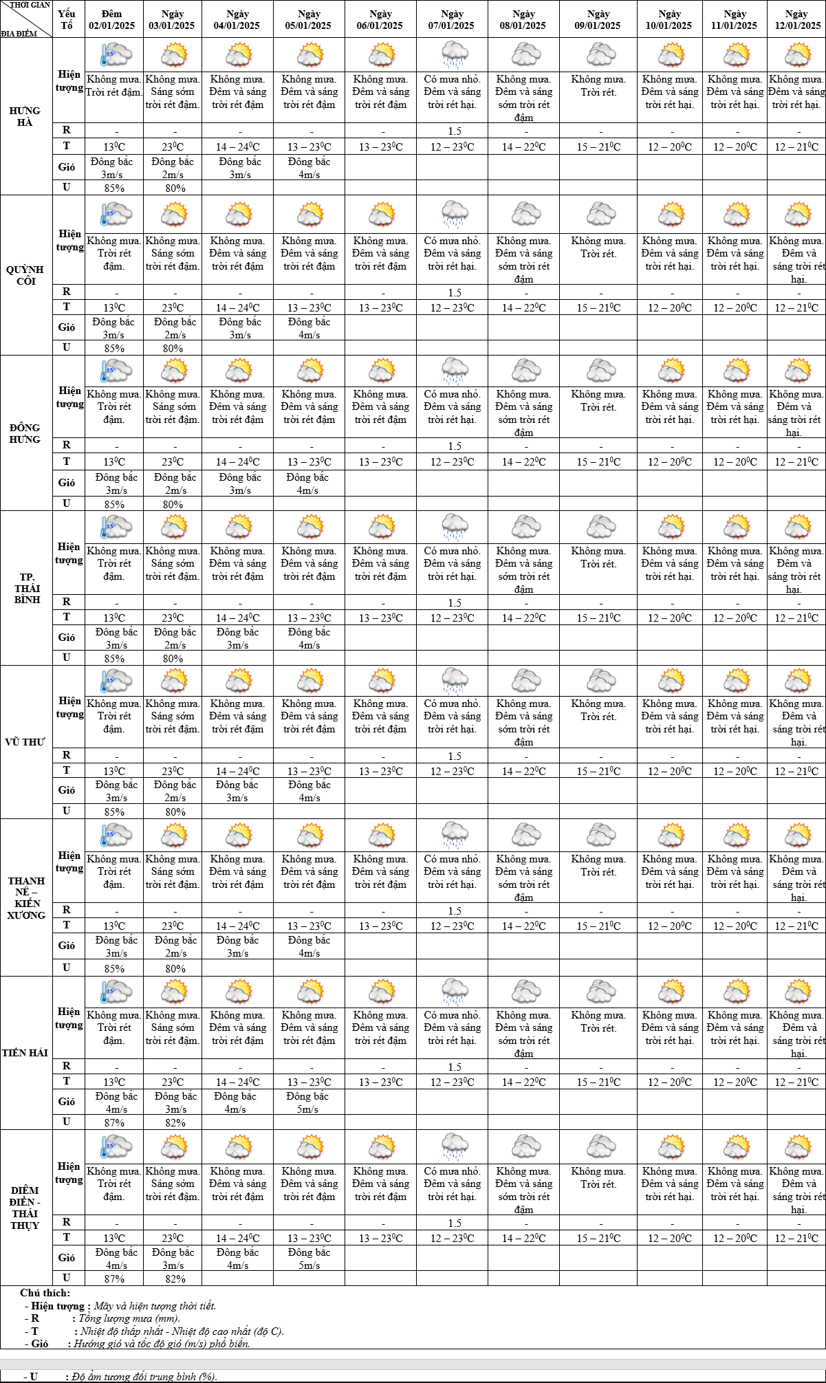 DỰ BÁO THỜI TIẾT ĐIỂM 10 NGÀY KHU VỰC THÁI BÌNH TỪ ĐÊM 02 – 12/01/2025