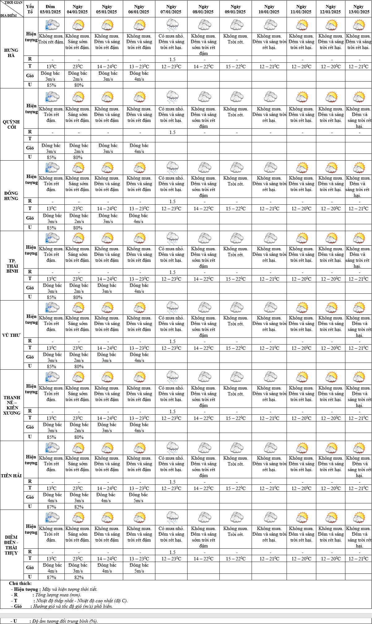 DỰ BÁO THỜI TIẾT ĐIỂM 10 NGÀY KHU VỰC THÁI BÌNH TỪ ĐÊM 03 – 13/01/2025
