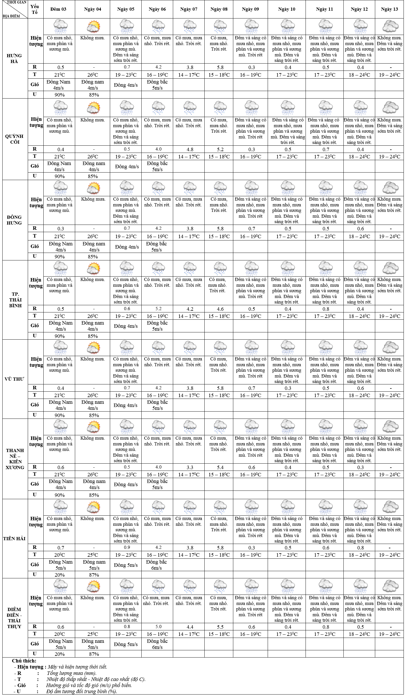 DỰ BÁO THỜI TIẾT ĐIỂM 10 NGÀY KHU VỰC THÁI BÌNH TỪ ĐÊM 03 – 13/3/2025