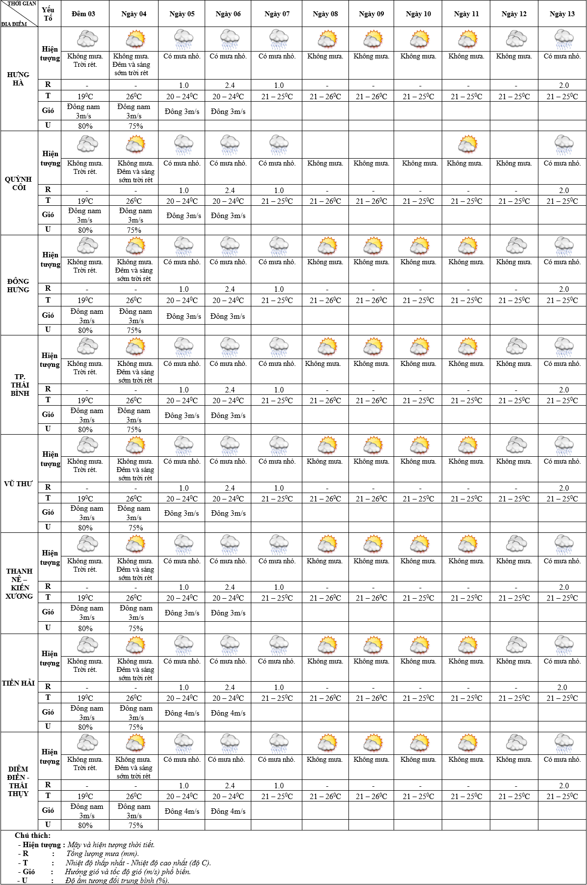 DỰ BÁO THỜI TIẾT ĐIỂM 10 NGÀY KHU VỰC THÁI BÌNH TỪ ĐÊM 03 – 13/4/2025