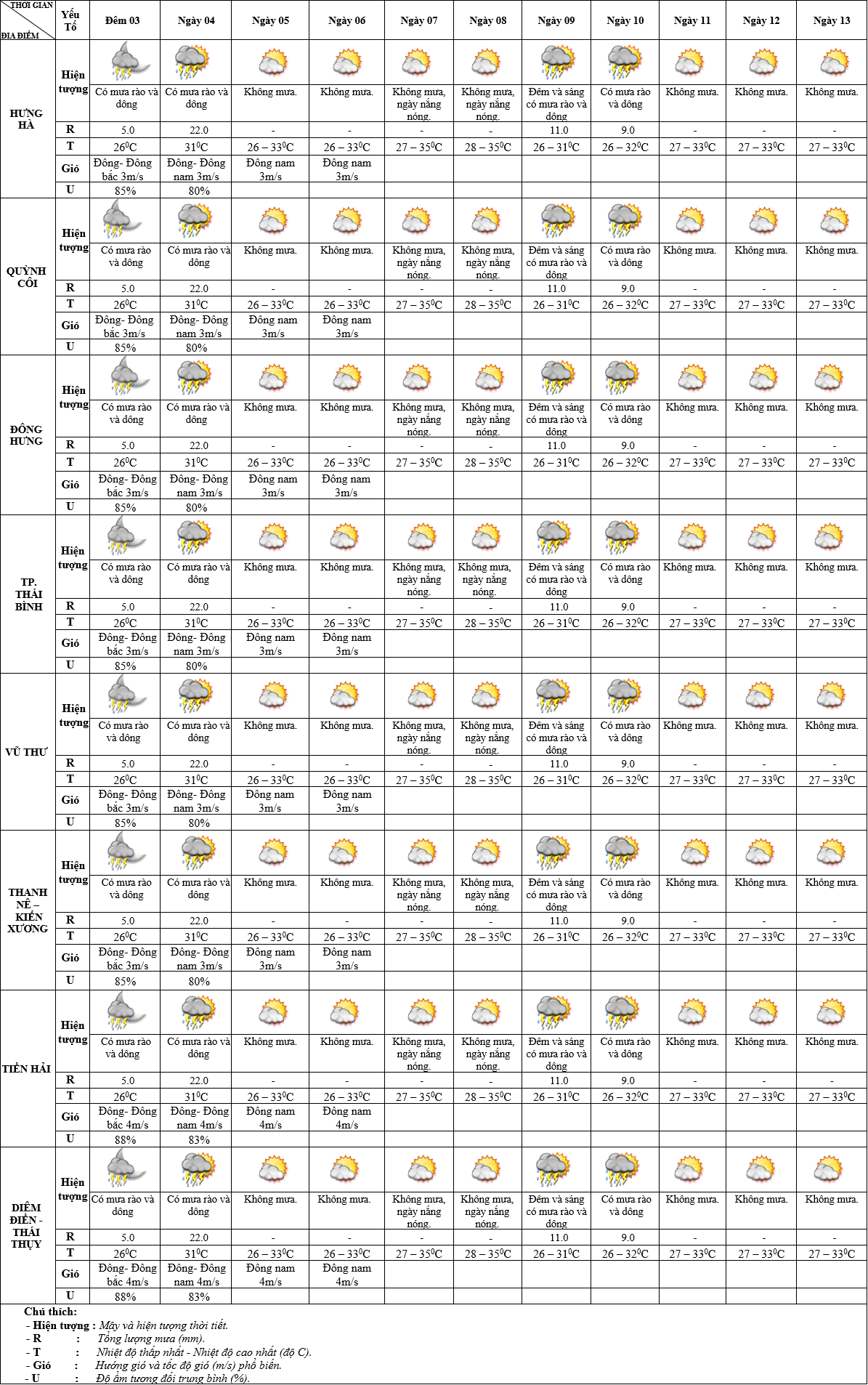 DỰ BÁO THỜI TIẾT ĐIỂM 10 NGÀY KHU VỰC THÁI BÌNH TỪ ĐÊM 03 – 13/6/2025