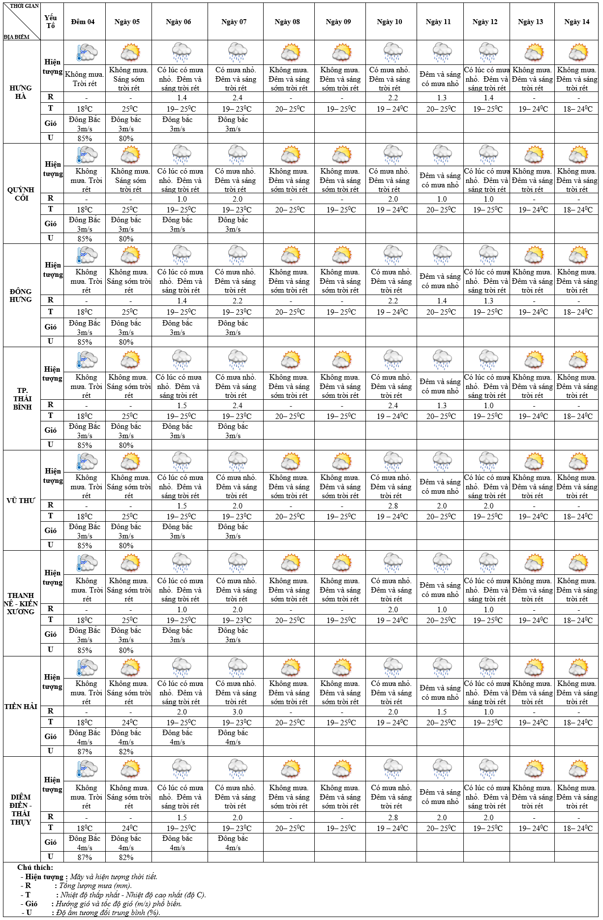 DỰ BÁO THỜI TIẾT ĐIỂM 10 NGÀY KHU VỰC THÁI BÌNH TỪ ĐÊM 04 – 14/01/2024