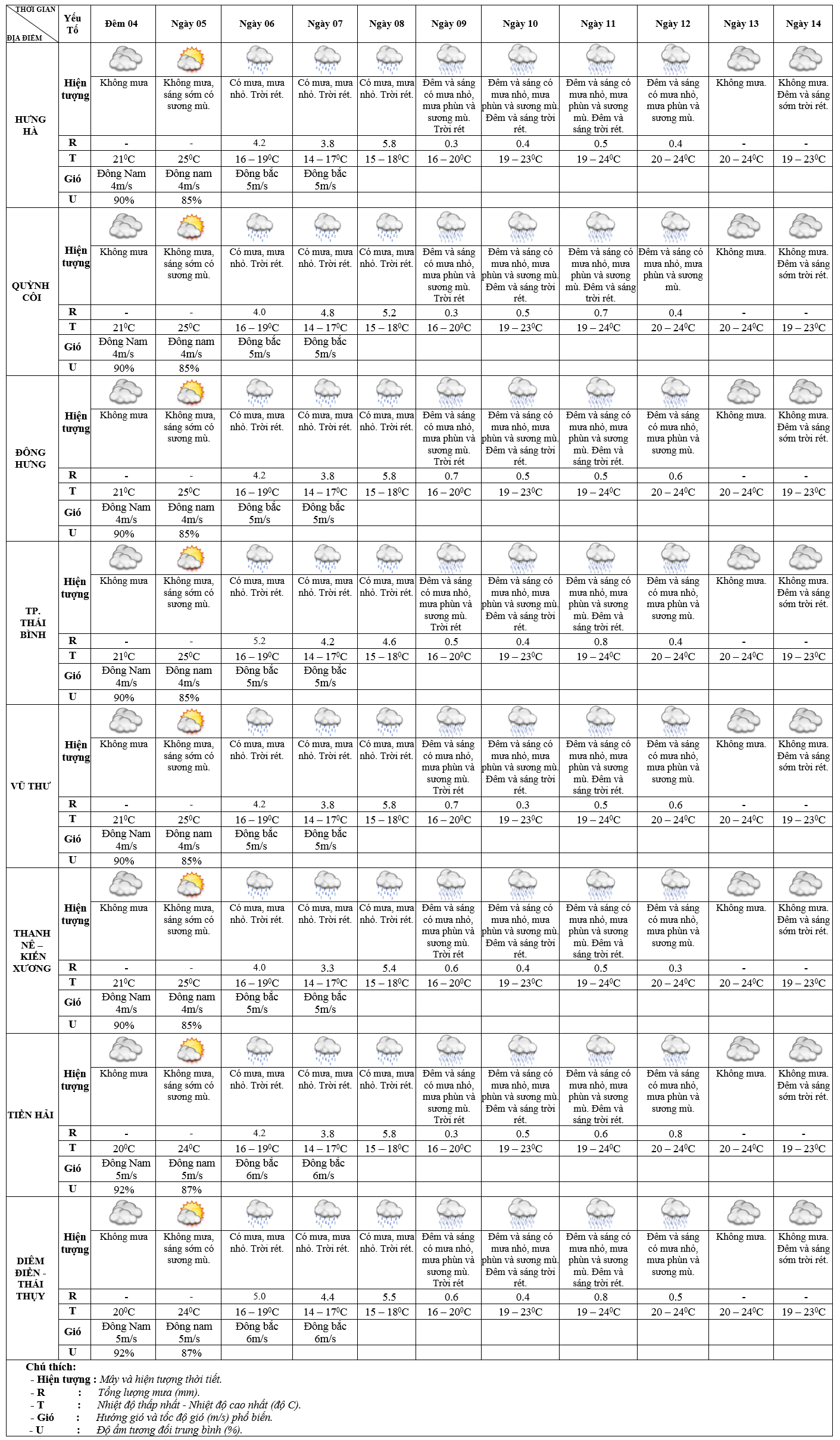 DỰ BÁO THỜI TIẾT ĐIỂM 10 NGÀY KHU VỰC THÁI BÌNH TỪ ĐÊM 04 – 14/3/2025