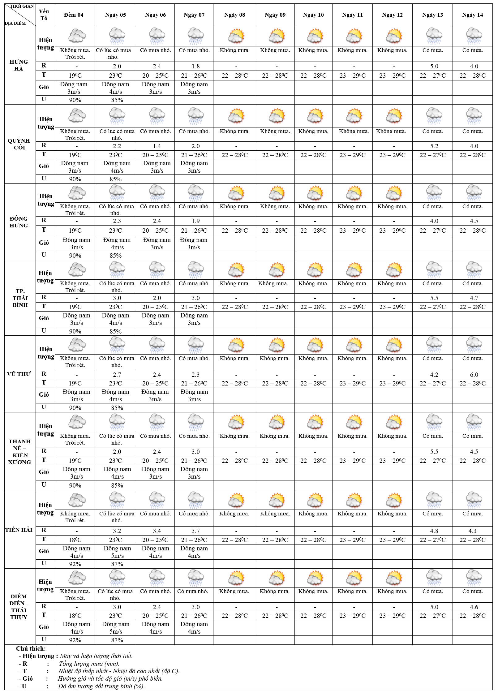 DỰ BÁO THỜI TIẾT ĐIỂM 10 NGÀY KHU VỰC THÁI BÌNH TỪ ĐÊM 04 – 14/4/2025