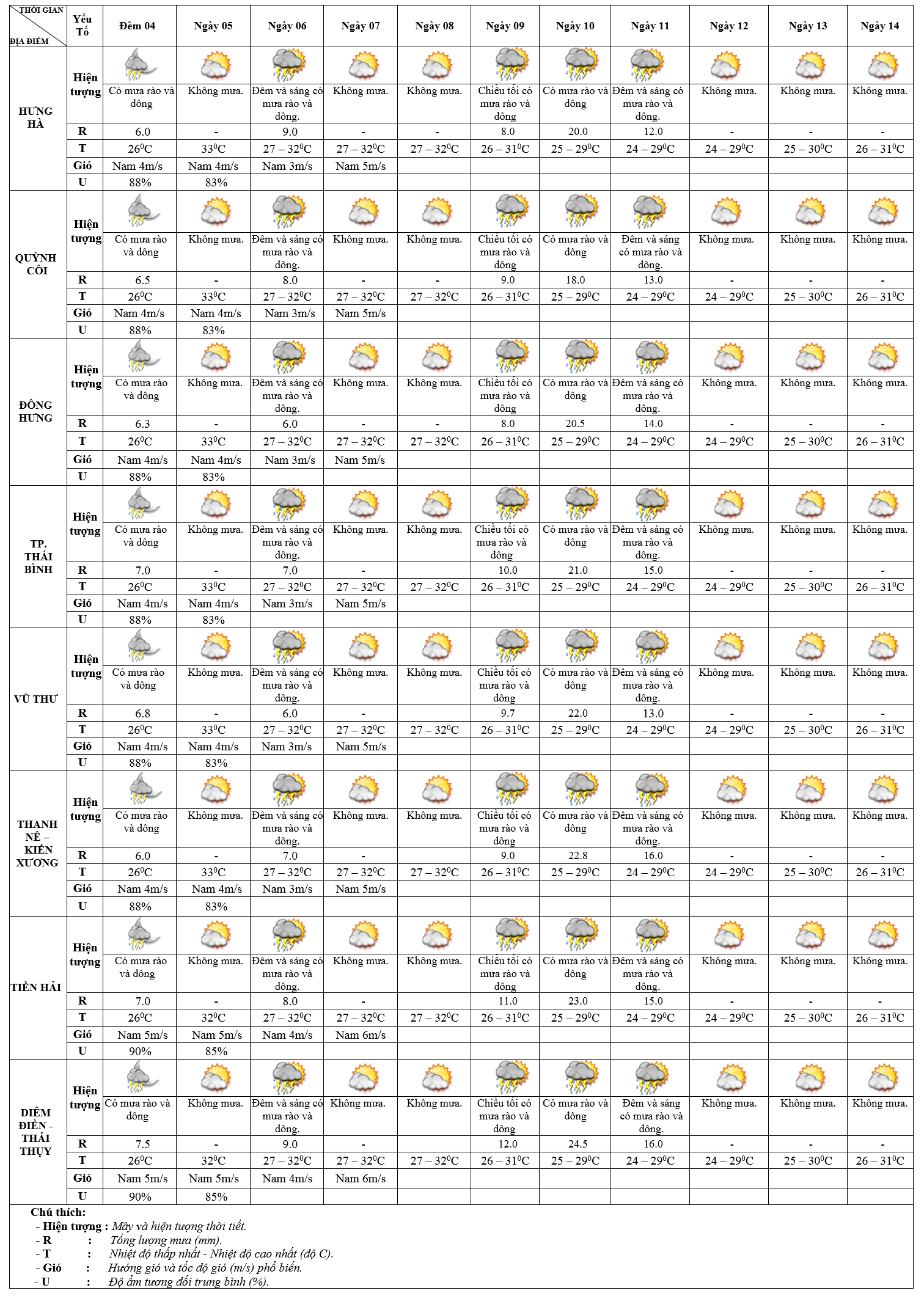 DỰ BÁO THỜI TIẾT ĐIỂM 10 NGÀY KHU VỰC THÁI BÌNH TỪ ĐÊM 04 – 14/5/2025