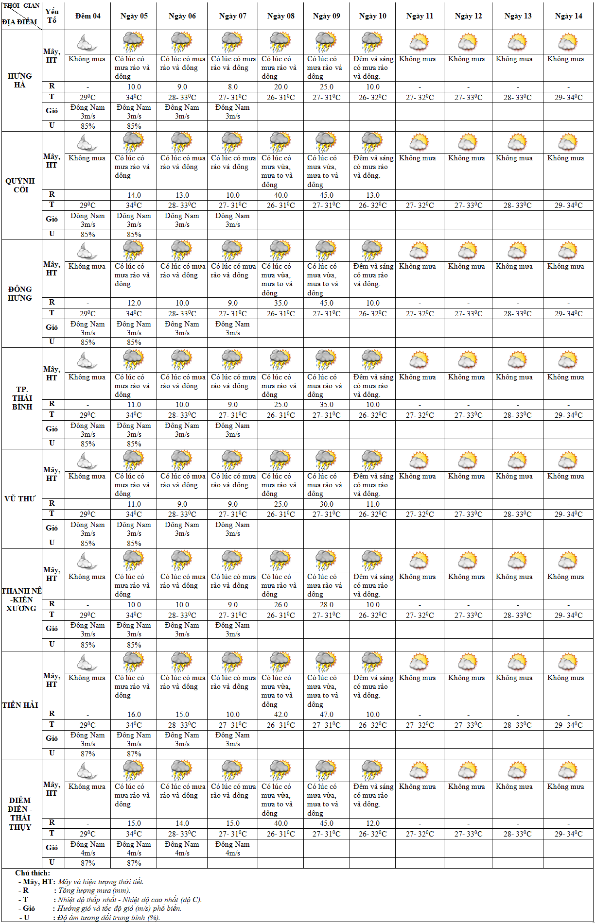DỰ BÁO THỜI TIẾT ĐIỂM 10 NGÀY KHU VỰC THÁI BÌNH TỪ ĐÊM 04 – 14/7/2021