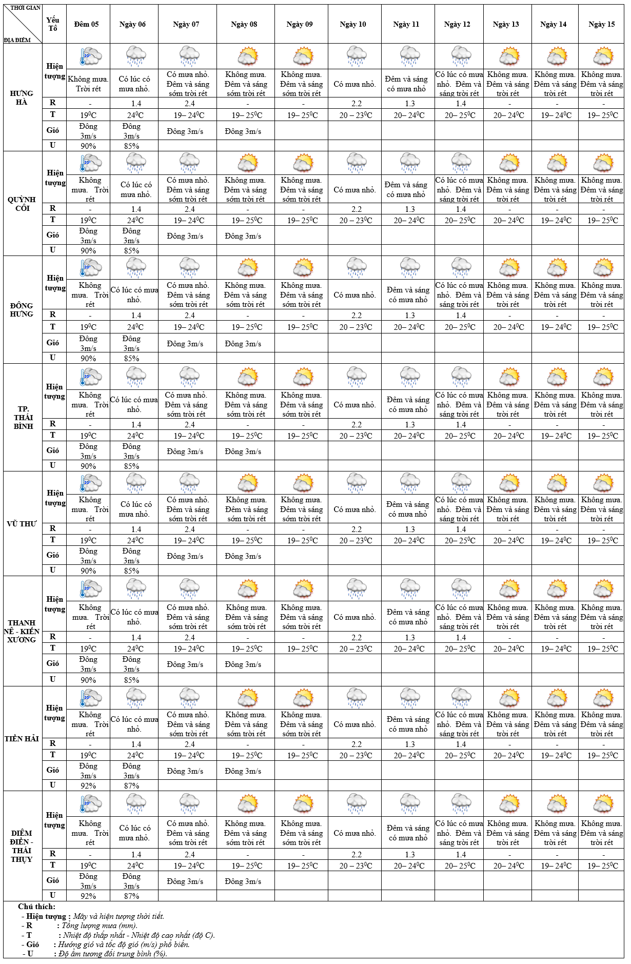 DỰ BÁO THỜI TIẾT ĐIỂM 10 NGÀY KHU VỰC THÁI BÌNH TỪ ĐÊM 05 – 15/01/2024