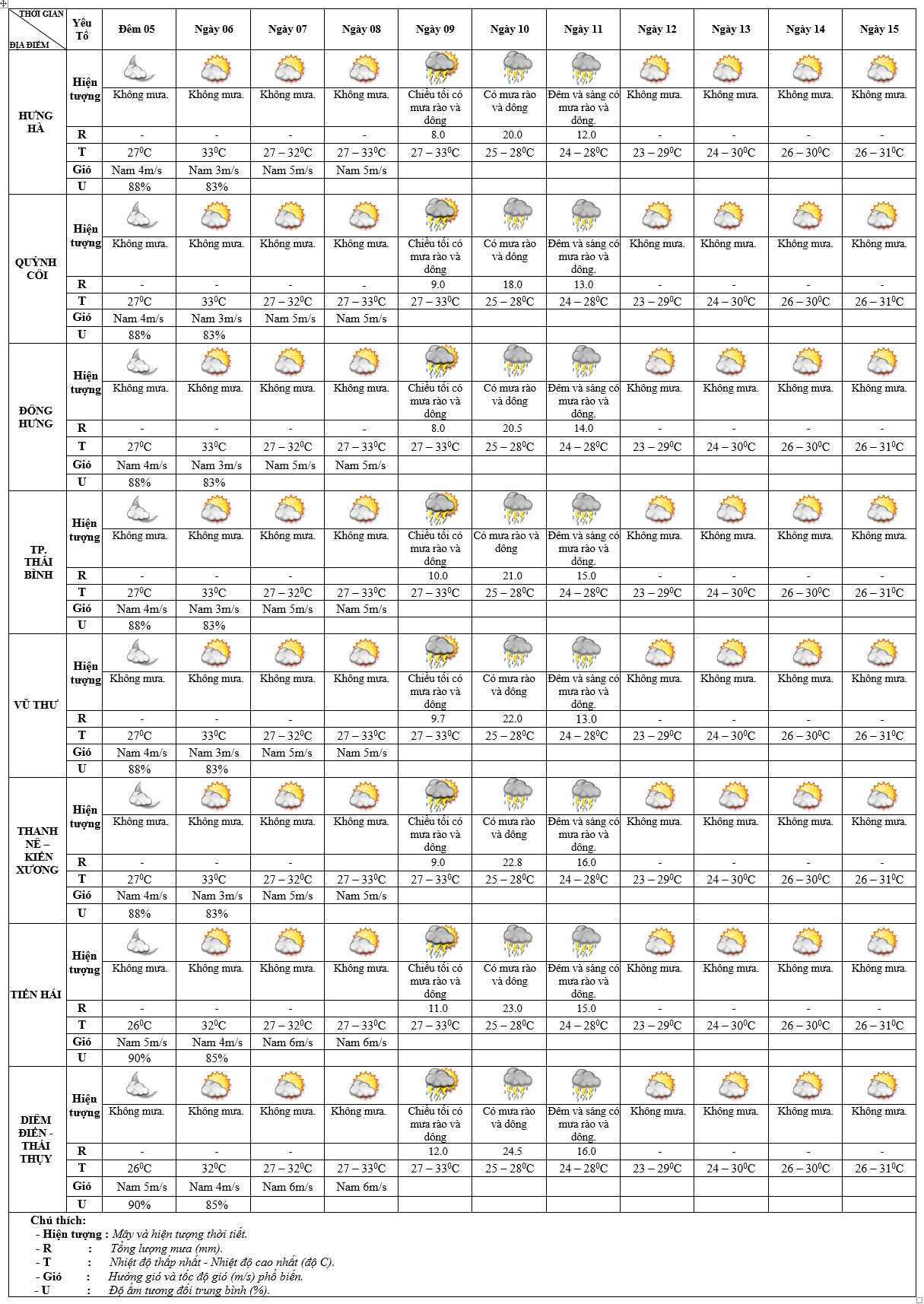 DỰ BÁO THỜI TIẾT ĐIỂM 10 NGÀY KHU VỰC THÁI BÌNH TỪ ĐÊM 05 – 15/5/2025