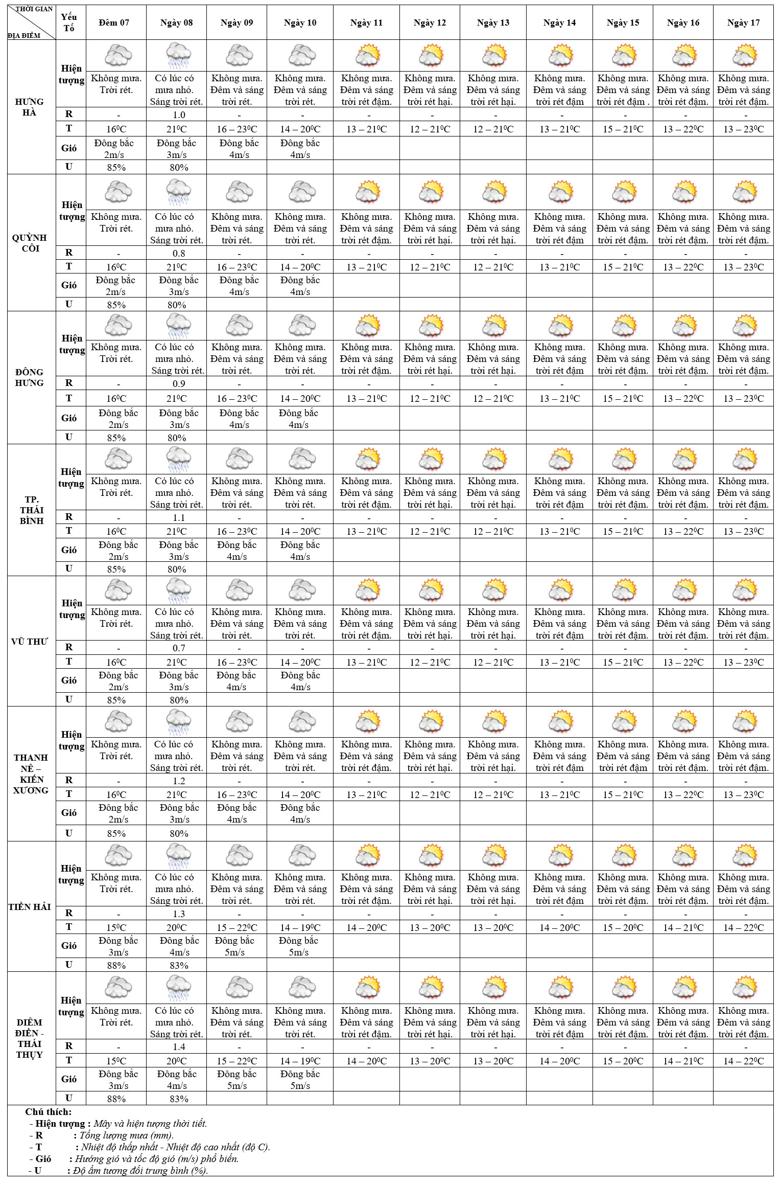 DỰ BÁO THỜI TIẾT ĐIỂM 10 NGÀY KHU VỰC THÁI BÌNH TỪ ĐÊM 07 – 17/01/2025