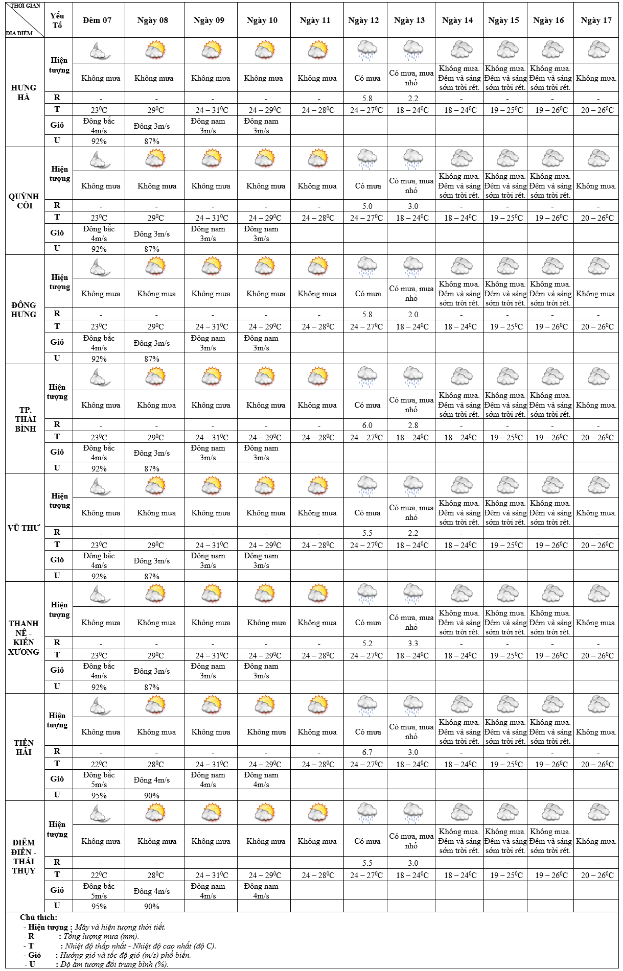 DỰ BÁO THỜI TIẾT ĐIỂM 10 NGÀY KHU VỰC THÁI BÌNH TỪ ĐÊM 07 – 17/11/2023