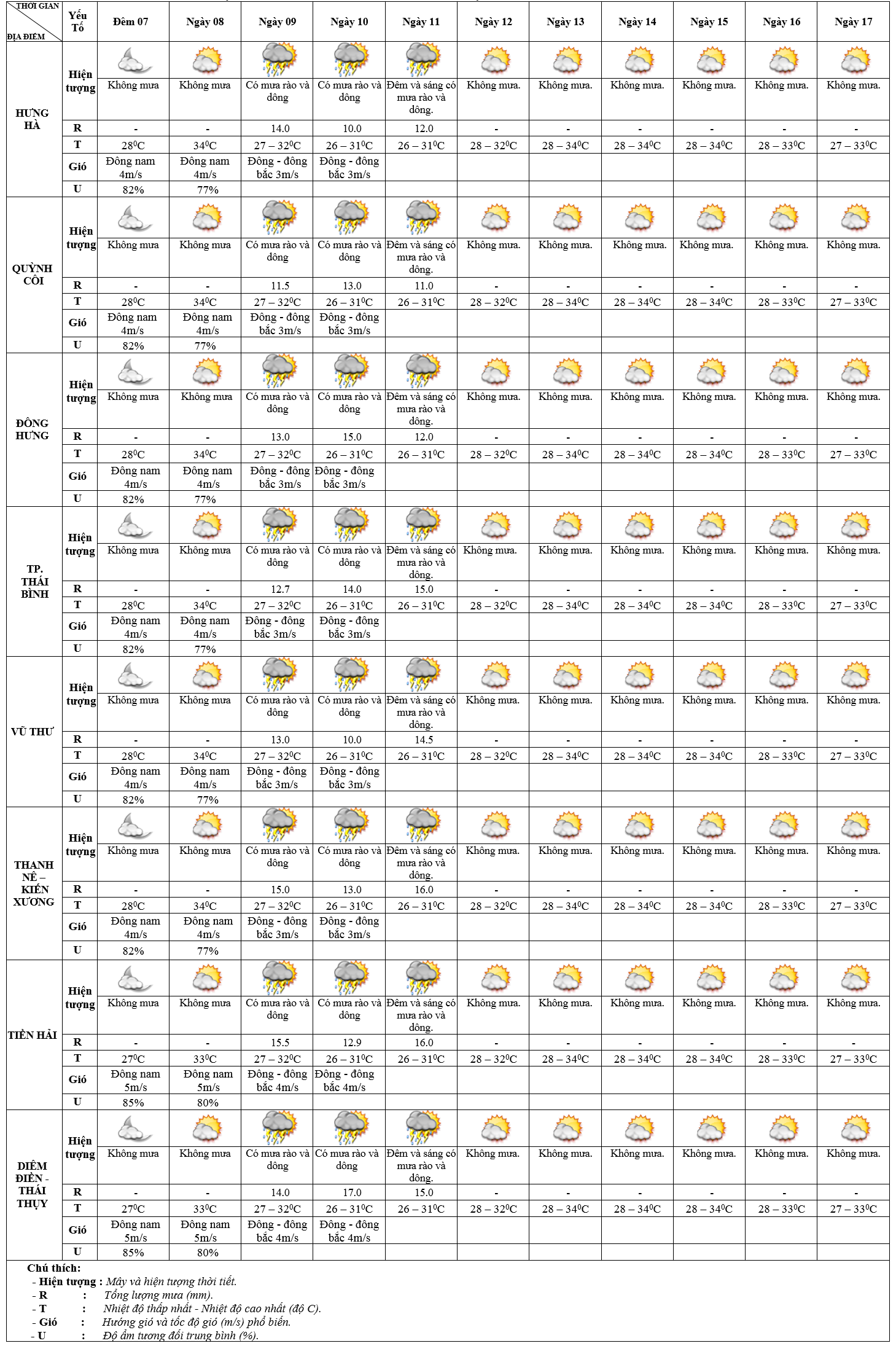 DỰ BÁO THỜI TIẾT ĐIỂM 10 NGÀY KHU VỰC THÁI BÌNH TỪ ĐÊM 07 – 17/6/2025